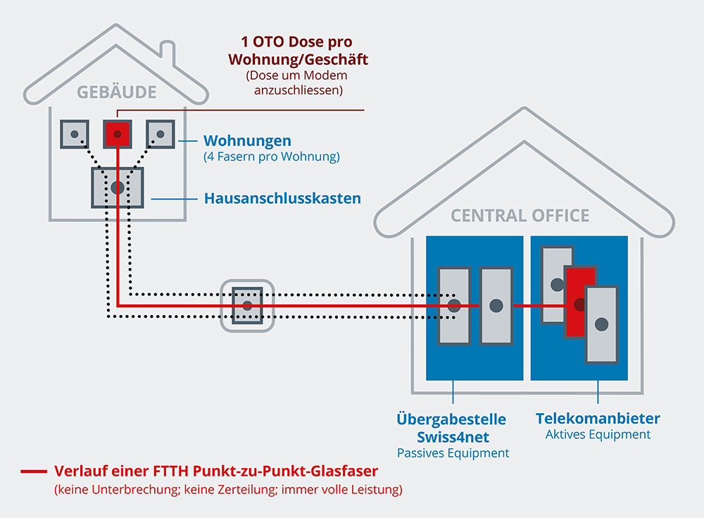 Das Glasfasernetz ist vollständig ausgebaut und bietet eine zukunftssichere Infrastruktur für Wohn- und Geschäftsliegenschaften. Jede Wohn- oder Geschäftseinheit verfügt über genügend Glasfasern, die direkt von der Zentrale bis zur optischen Telekommunikationsdose (OTO-Dose) geführt und aufgeschaltet sind.