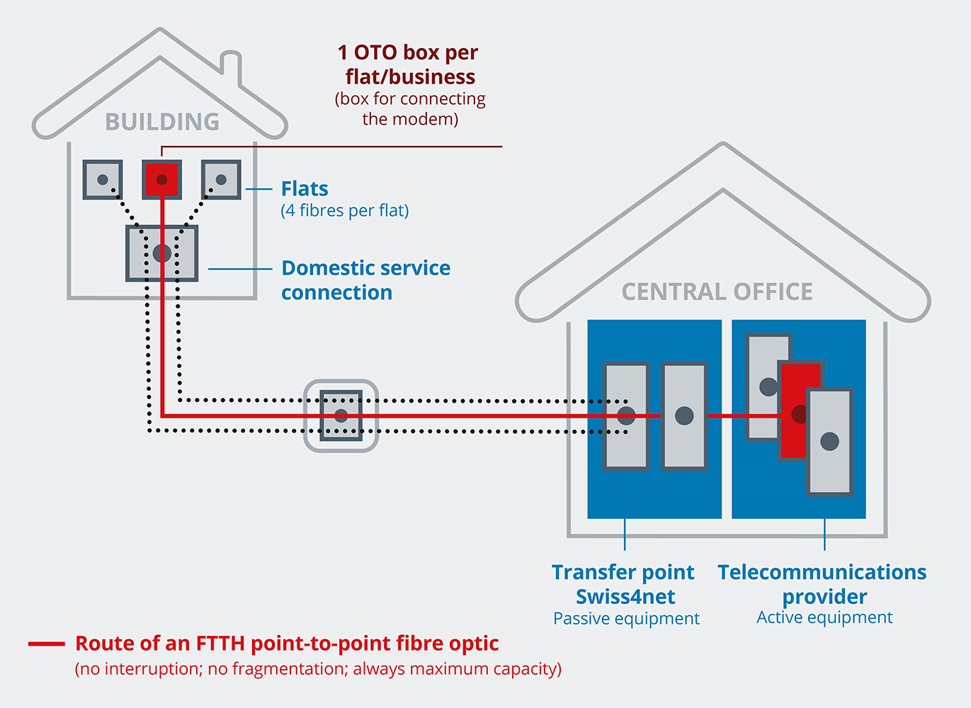 New builds on greenfield sites and vertical extensions to existing buildings in Ascona are generally connected to the point-to-point fibre optic network free of charge. This initial connection is implemented directly from the central office to the optical telecommunications outlet (OTO) and enables immediate use of the fibre optic connection.